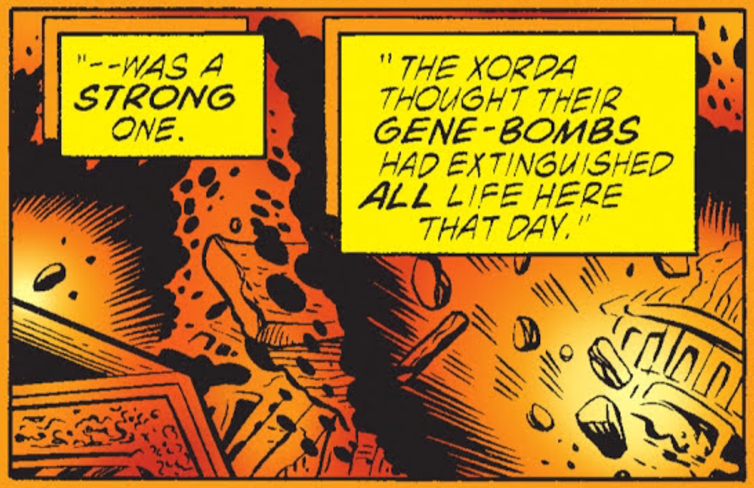 As vengeance for murdering their emissary, the Xorda bombarded the planet with Gene Bombs, which were made to genetically destroy only the human population but preserve the rest of the life on the planet as it was at the time. All human life was wiped out (in its current form), with the exception of a passenger craft which was in low Earth orbit during the attack. Their ship crashed into a mountain, and its surviving population went on to form the hidden city of Station Square.[2][1]
