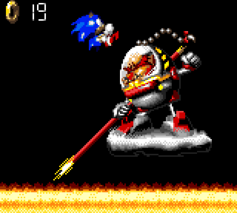 This boss needs to be hit twelve times. However, these hits must be dealt precisely into the protective glass cover of the Yellow Desert Zone boss. Trying to hit this boss vehicle from any other spot will simply bounce the player back without dealing any damage. Hitting this boss below the protective glass cover while Robotnik is picking the ground is particularly bad since this will bounce the player right into the spear. Hitting Robotnik when he does not move at all will cause him to go off-screen prematurely to execute his staff attack afterward.